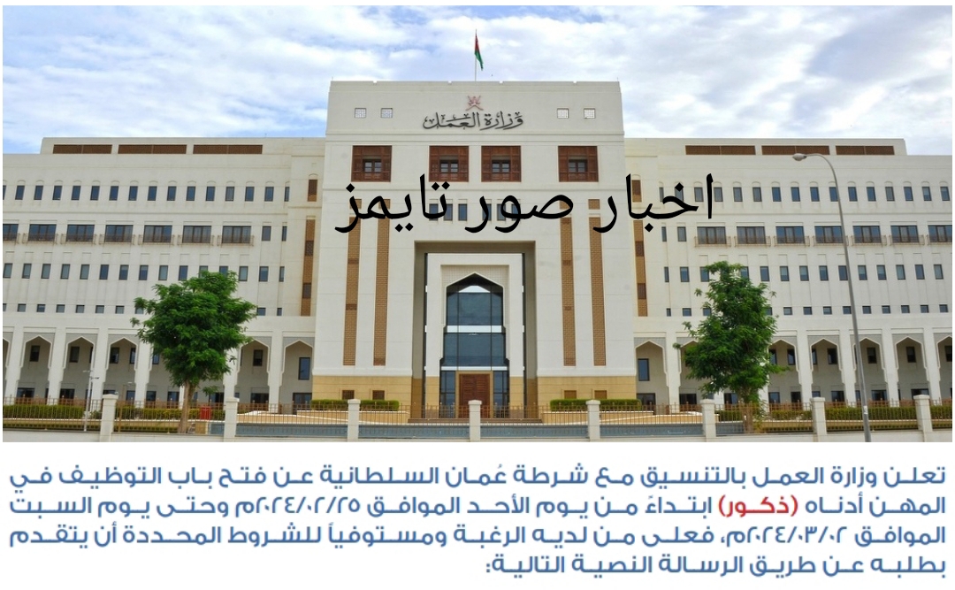 تُعلن “وزارة العمل” بالتنسيق مع “شرطة عُمان السلطانية” عن فتح باب التوظيف في المهن أدناه (ذكور ). ابتداءً من يوم الأحد الموافق 25 فبراير 2024م. وحتى يوم السبت الموافق 2 مارس 2024م.